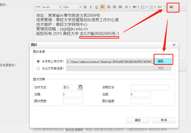 第二步:鼠标点击到需要添加备案号图标的位置,选择添加准备好的备案号图标,点击确定;
