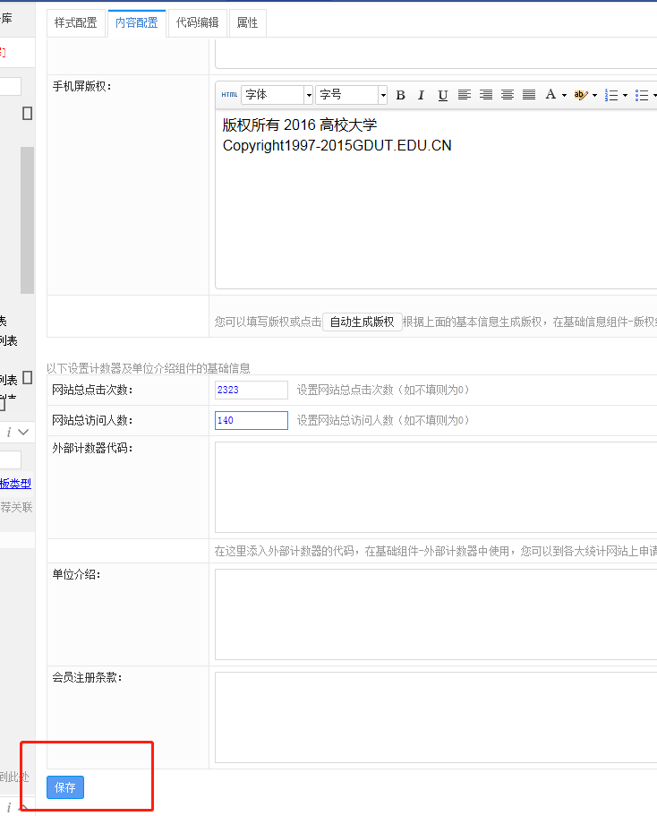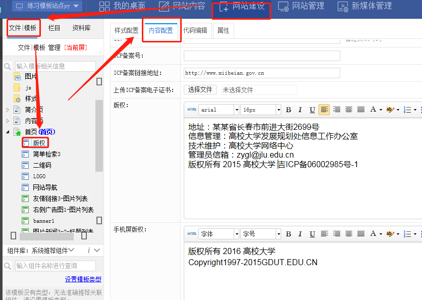 第一步:登录后台网站建设——文件/模板,点击版权组件内容配置,找到版权维护的界面;