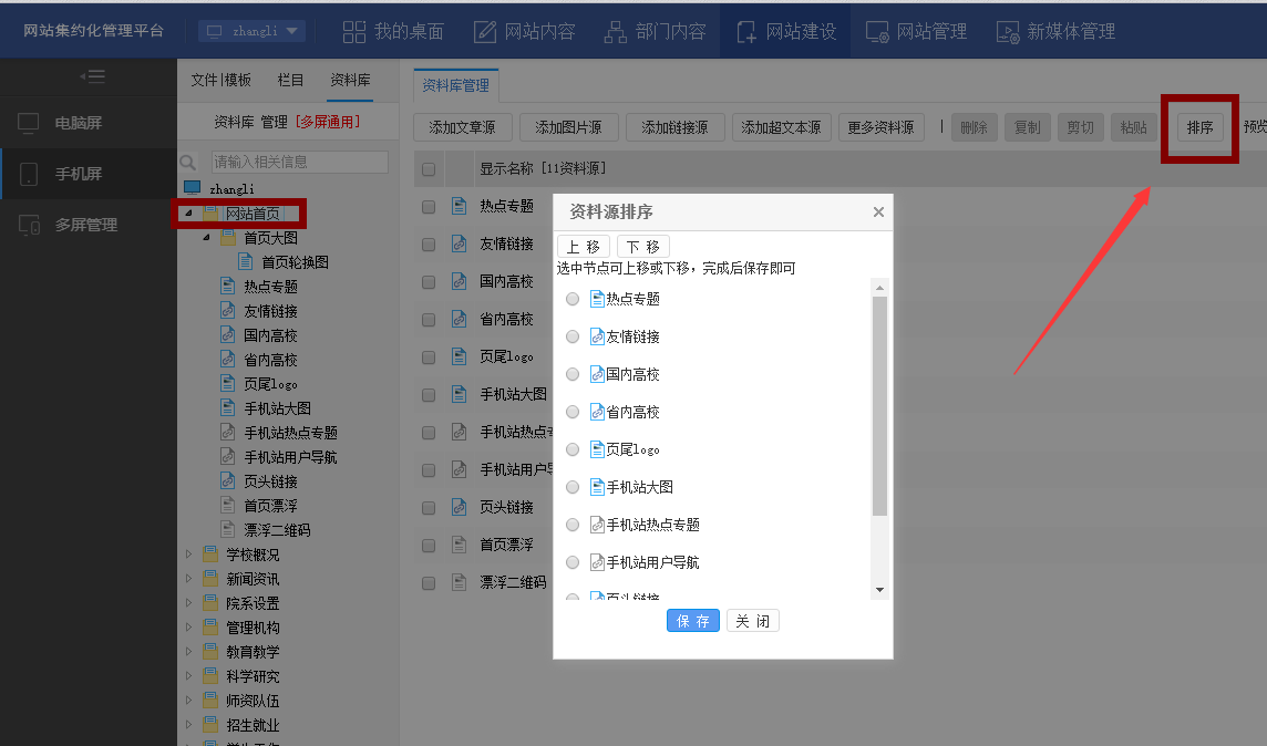 网站建设--资料库--选择“栏目”---点击排序,通过上移下移对栏目下的资料源排序。