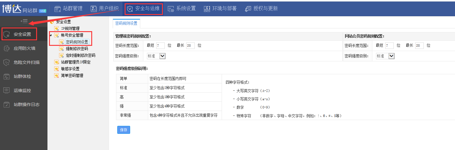 1.登录系统管理-安全与运维-安全设置-账号安全管理,根据下面的密码强度说明,设置规则即可。