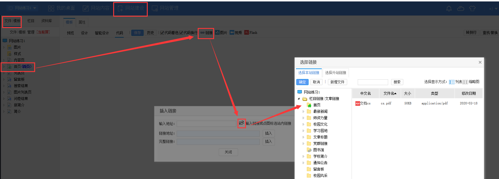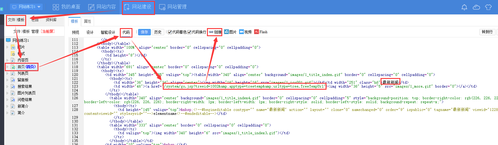 3.删除现有的链接,点击上方的链接,重新链接相应的栏目,保存模板,发布网站就可以了。
