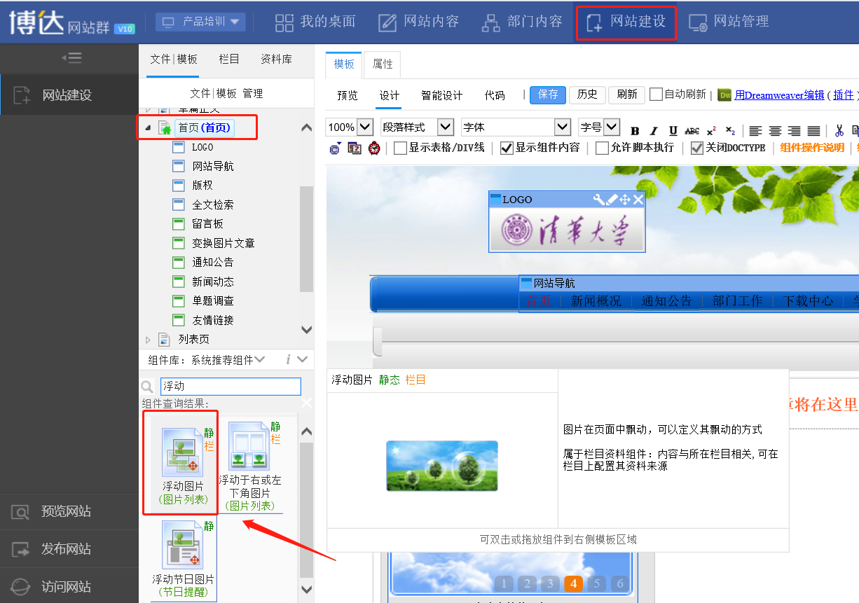 在组件库中---栏目资料组件----图片列表---选择浮动图片组件即可