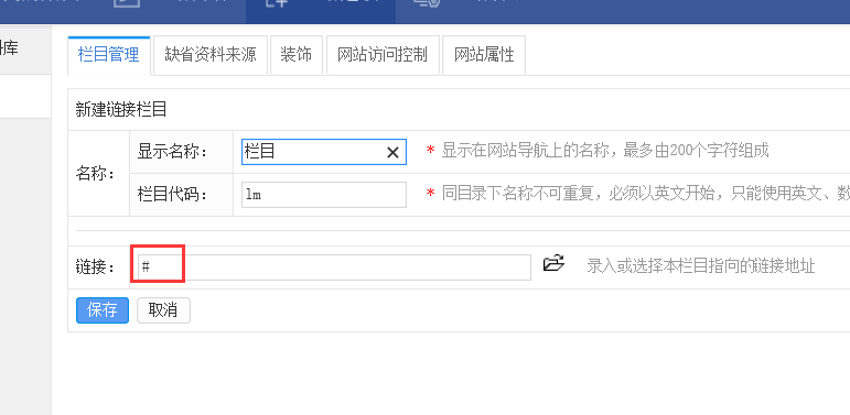 2.将新建链接栏目的地址,设为“#”,点击保存,就新建成功了。