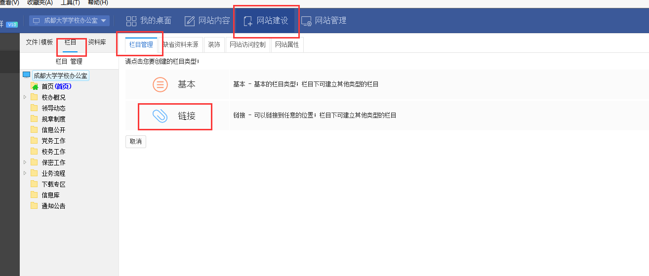 1.登录网站管理-->网站建设-->栏目-->新建栏目,点击栏目管理,建立连接栏目。