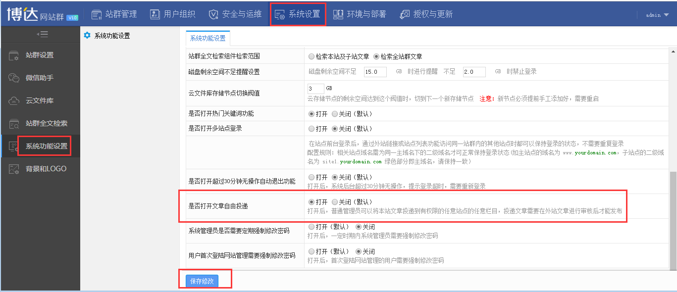 这是由于对普通管理员自由投递的设置没有打开,需要普通管理员自由投递的话需要登录系统管理,在系统设置-->系统功能设置-->是否打开文章自由投递,选择打开选项,点击下方的保存修改,如下图: