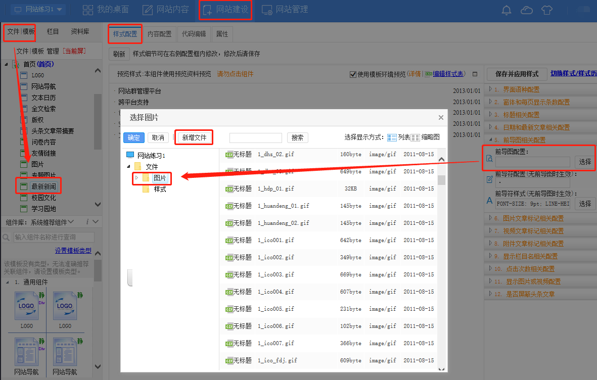 问题描述:在使用标题列表组件对应的栏目下,文章标题前面可以添加小图标吗?解决方案:1.登录网站管理-网站建设-在文件模板中找到需要修改的栏目对应的组件,然后在右边点击前导图相关配置,可以上传小图标,然后点击确定,重新发布一下网站,就可以看到效果了