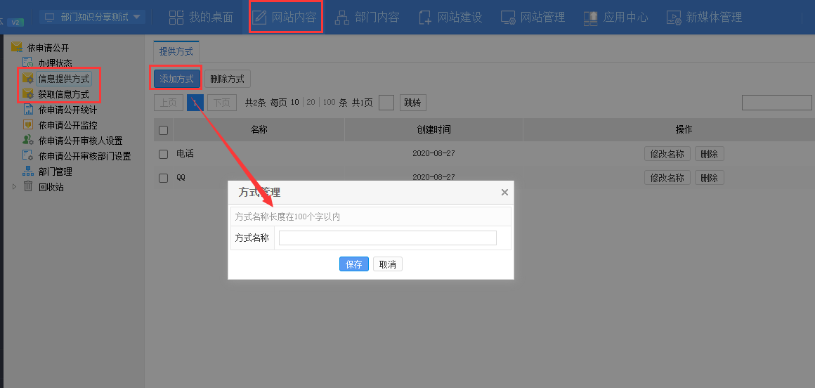 点击 信息提供方式/获取信息方式,点击“添加方式”,在弹出的窗口中输入方式名称,保存即可。