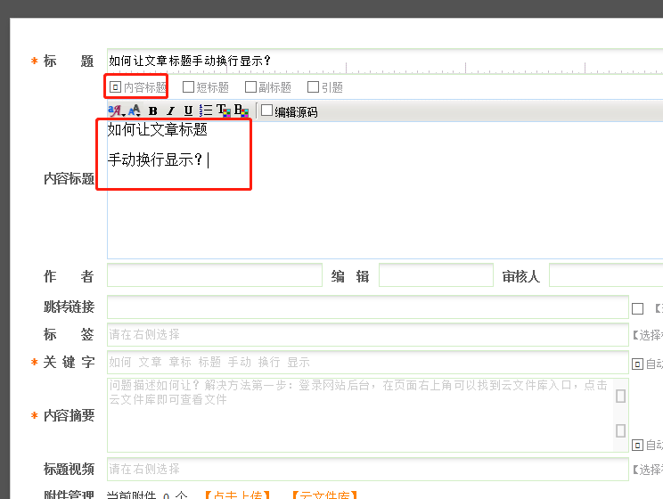 第一步:登录网站后台,在维护文章的编辑器页面,标题下面点击选中内容标题,在内容标题的文本框中输入文章标题,然后按照自己的需要进行对应换行,点击发布即可查看效果。
