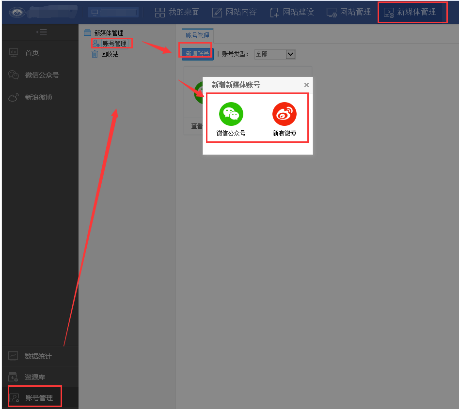 1.登陆网站管理,点击新媒体管理,在左下角点击账号管理先新增微博公众号或者微信公众号