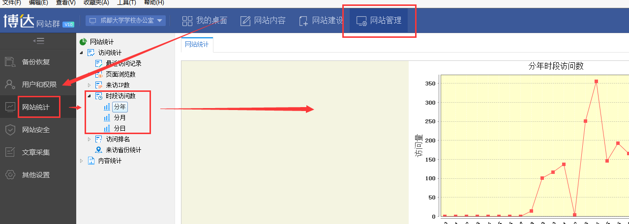 登录网站管理->站点网站管理->网站统计->时段访问数,点击分年、分月、分日,以图像的形式展现访问的情况。