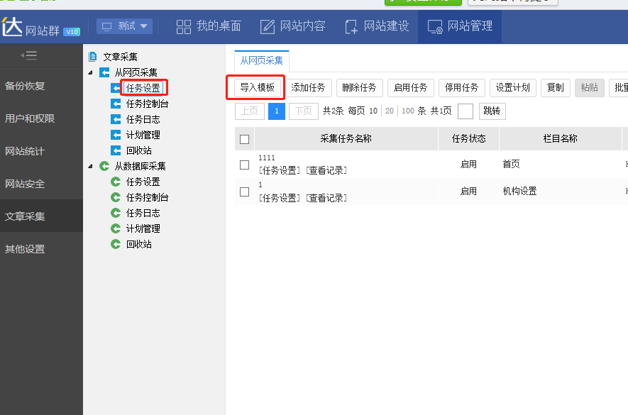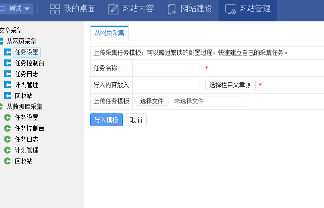 第一步:登录网站后台—网站管理—文章采集—任务设置,点击导入模板,选择对应栏目并且上传已经下载好的模板即可。