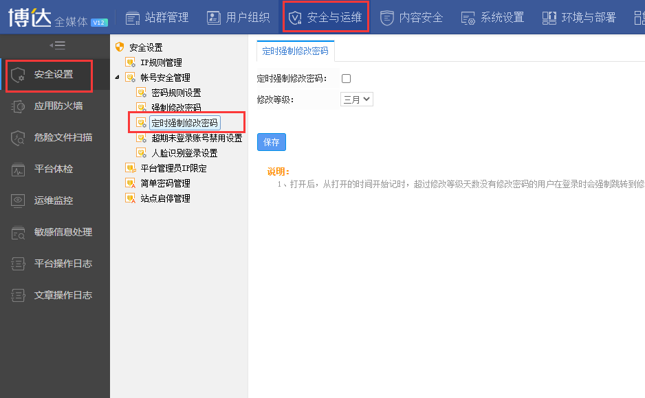步骤一:登录系统管理,找到安全与运维下的定时强制修改密码,如图1.1;