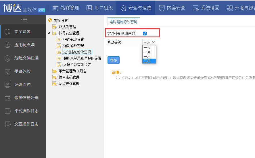 步骤二:勾选定时强制修改密码选项框,设置修改等级,默认为三个月修改一次,如图1.2;