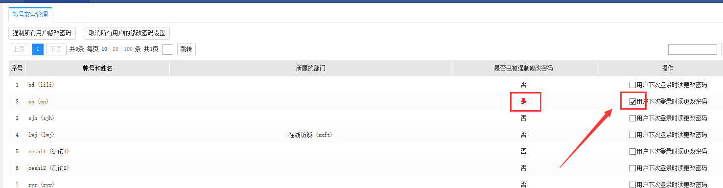 第二步:点击需要强制修改密码账号的用户下次登录时须更改密码前的选择框,选中后是否已被强制修改密码自动改为是,如图1.2;