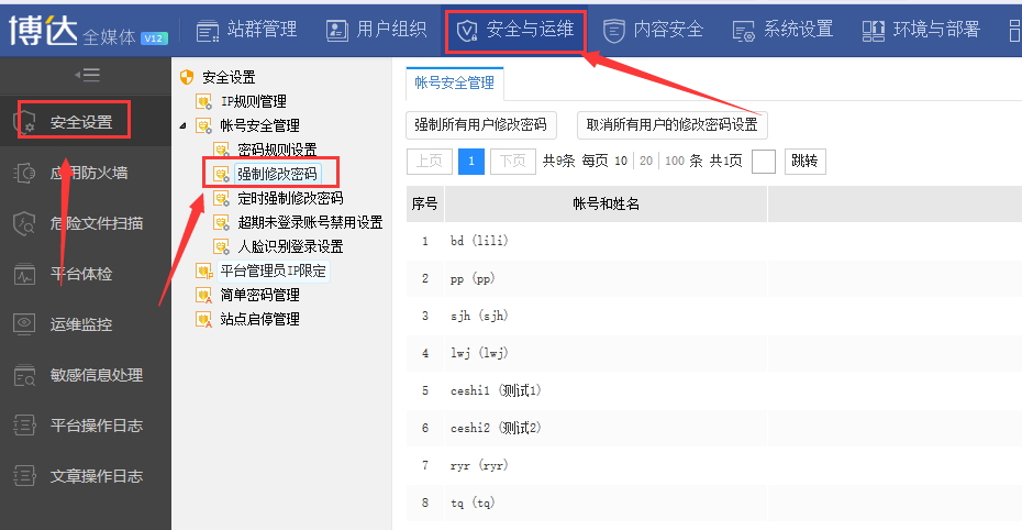 第一步:登录系统管理,点击安全与运维,找到强制修改密码栏目,如图1.1;