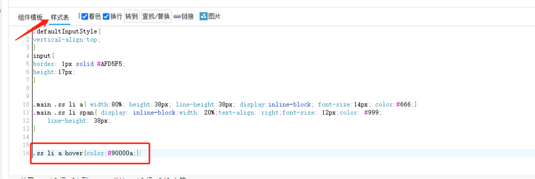 步骤三:点到样式表中,添加“.ss li a:hover{color:#90000a;}”(“#90000a”色值可根据需求修改),如图1.3。