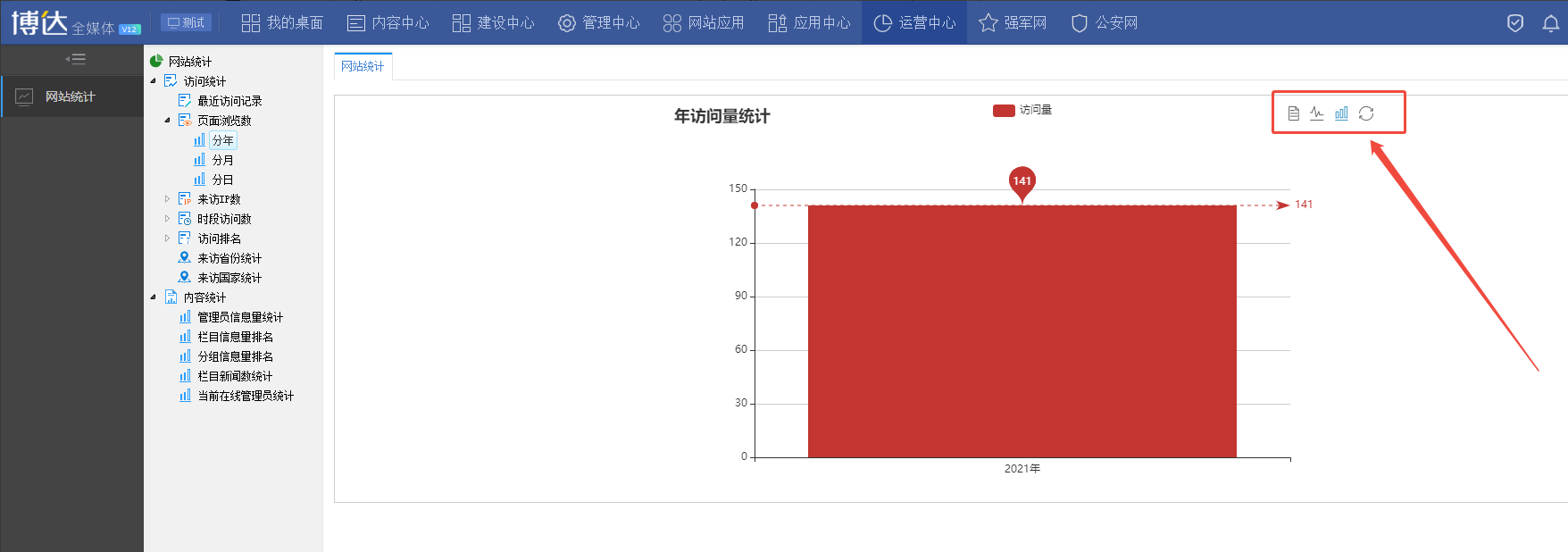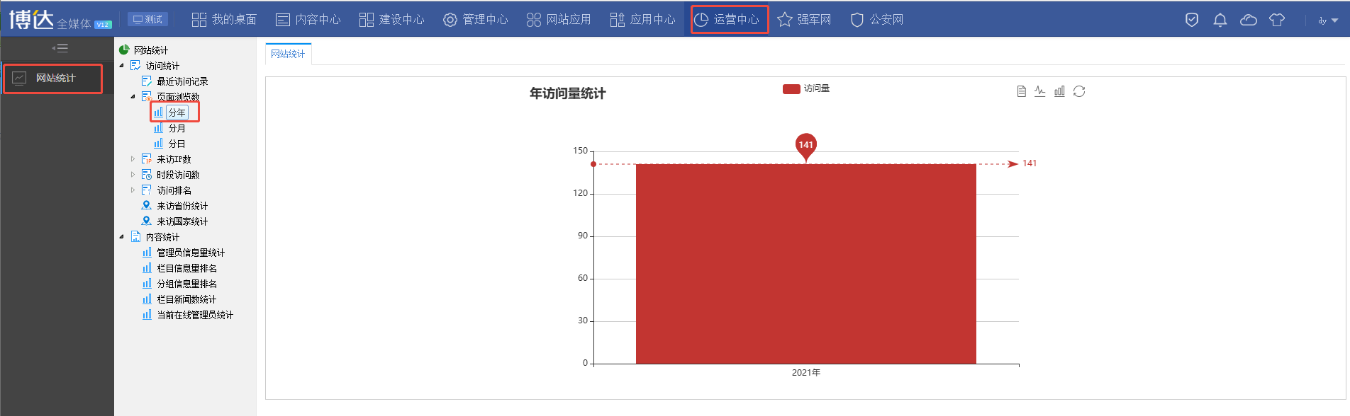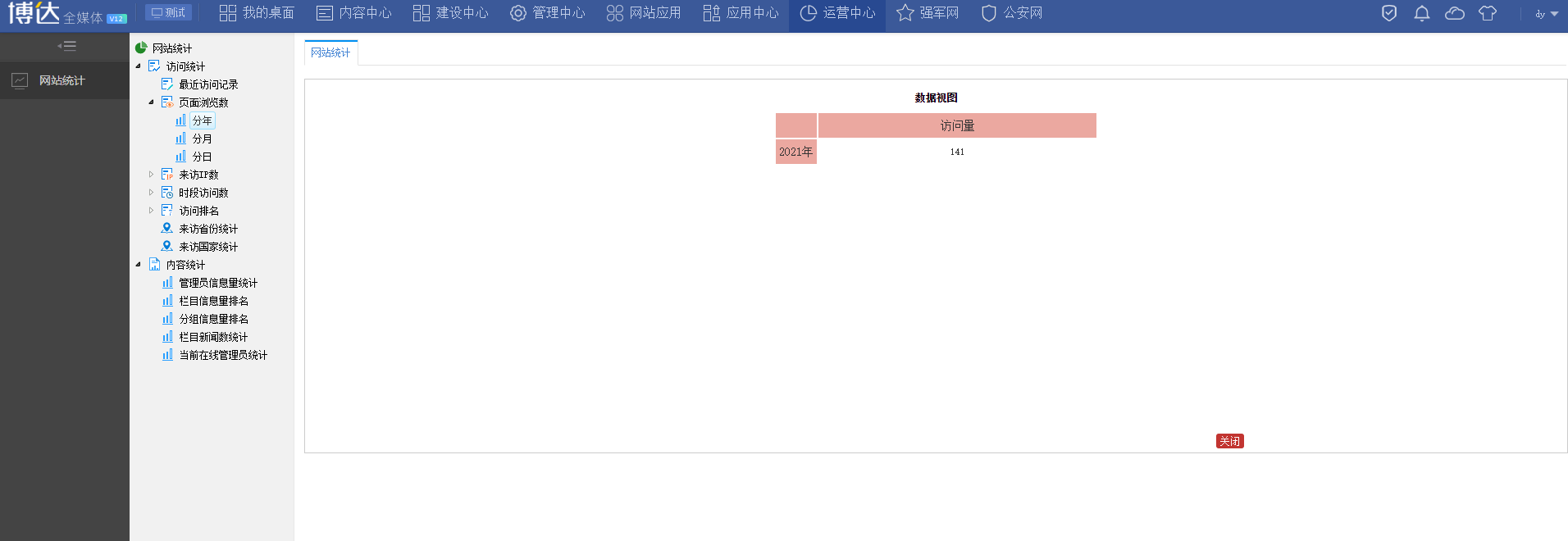步骤:登录网站群后台站点管理,选择上方“运营中心”栏目模块,然后点击“网站统计”右侧子栏目“页面浏览数”,下面子栏目可以分别按年、月、日查看访问量。如图1.1所示: